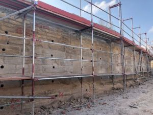 Um die einsturzgefährdeten alten Mauern nicht abtragen zu müssen sondern in ihrer historischen Ausprägung beibehalten zu können, wurde ein Sanierungsverfahren gewählt, bei welchem durch rückseitige Pfeilervorlagen, die über Edelstahlnadeln mit dem Scheibenbauwerk der alten Stützwand verbunden werden, ein statisches System hergestellt wird, was auch die langfristige Standsicherheit der alten Mauern sicherstellt. Auf dem Foto kann man die Bohrungen zum Einlegen der Edelstahlanker deutlich erkennen.