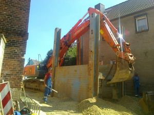 Die teilweise extremen Baugrundverhältnisse - z.B. Feinsand und starker Grundwasserzutritt – sind nur mit schwerem Verbau – hier Doppelgleitschienenverbau – zu bewältigen. Ohne vorlaufende Rück- und Umverlegungen anderer Medien zum Zuge der Trassenfreilenkung war da nichts zu machen.